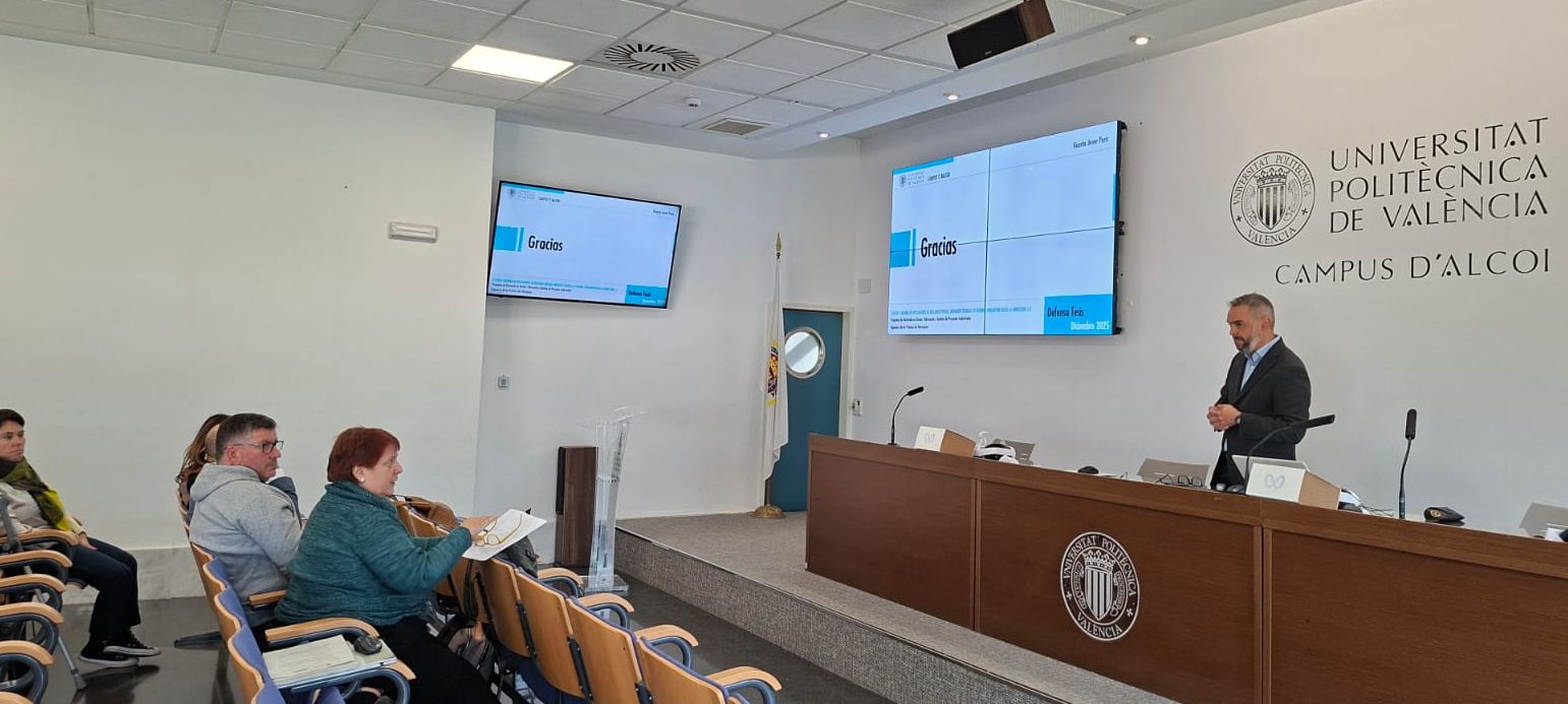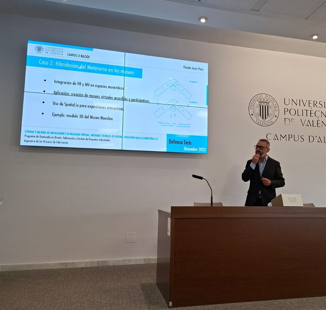 El día 1 de diciembre del 2025, tuvo lugar la defensa de la tesis doctoral, titulada «Estudio y mejora de aplicaciones de realidad virtual, mediante técnicas de diseño. Evolución hacia la industria 5.0», de nuestro compañero, el ahora Ph.D. Vicente Jover Peris. Esta tesis se enmarca dentro del programa de doctorado en Diseño, Fabricación y Gestión de Proyectos Industriales. Los directores de tesis han sido la Dra. Silvia Sempere y el Dr. Santiago Ferrandiz.