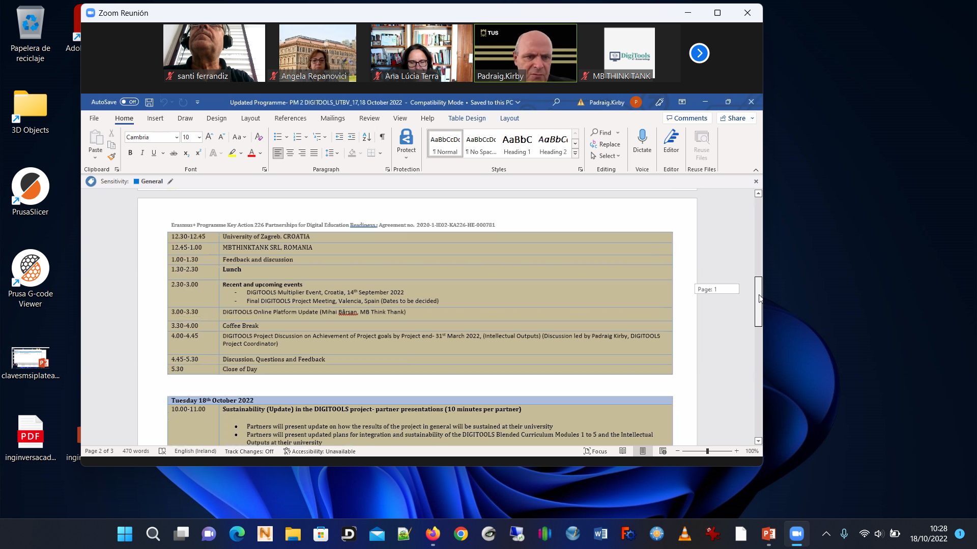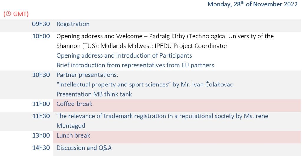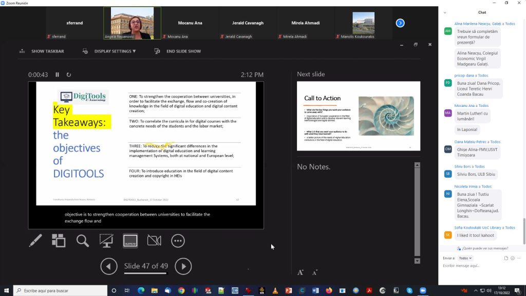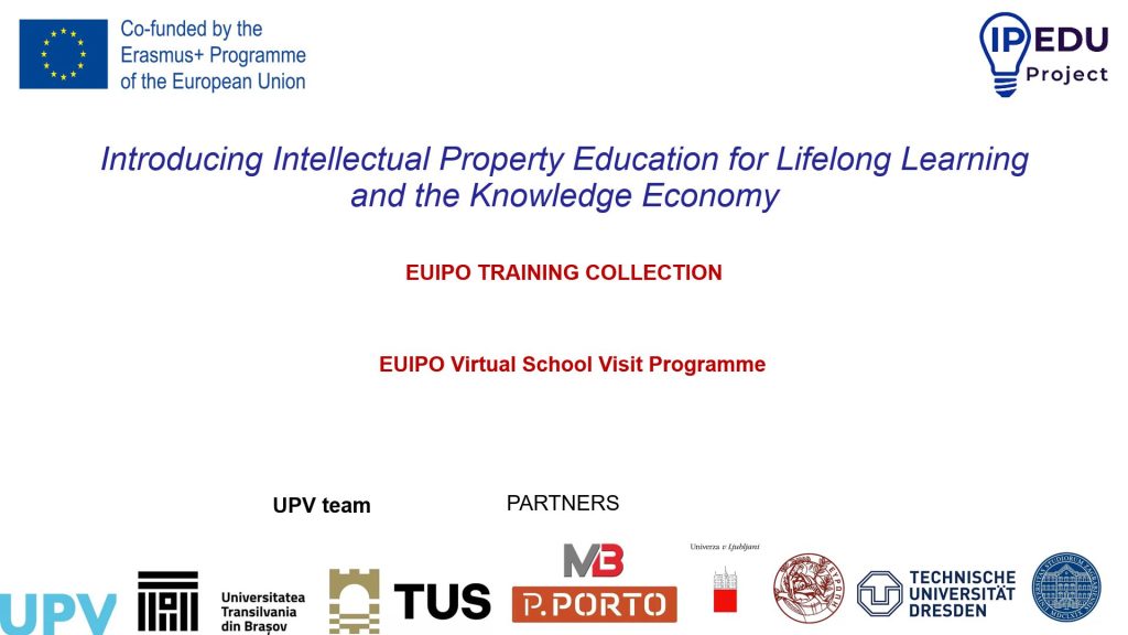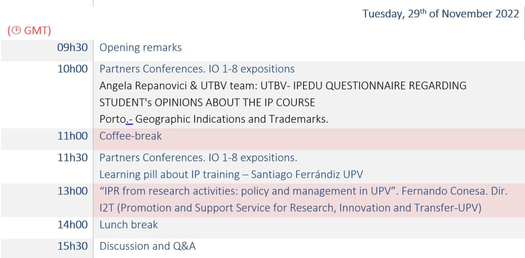 2nd day programProf. Angela Repanovici conference. UTBV TeamTraining pills presentation UPV teamEUIPO IP training Basics presentationMr. Fernando Conesa conference i2T UPVOn line partipants: from from University of Crete, Ms. Vicky TsagkarakiPartners teams
