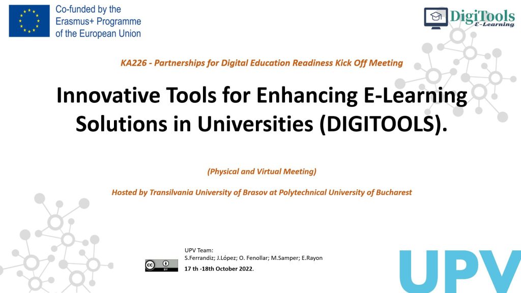 Today October, 17th 2022, began Kick Off Meeting 2022, of the project Innovative Tools for Enhancing E-Learning Solutions in Universities (DIGITOOLS). (Physical and Virtual Meeting). The meeting was hosted by Transilvania University of Brasov at Polytechnical University of Bucharest at Polytechnic University of Bucharest, Central Library, building A, floor 2, room 2.2, 313 Independence Street, Bucharest, sector 6