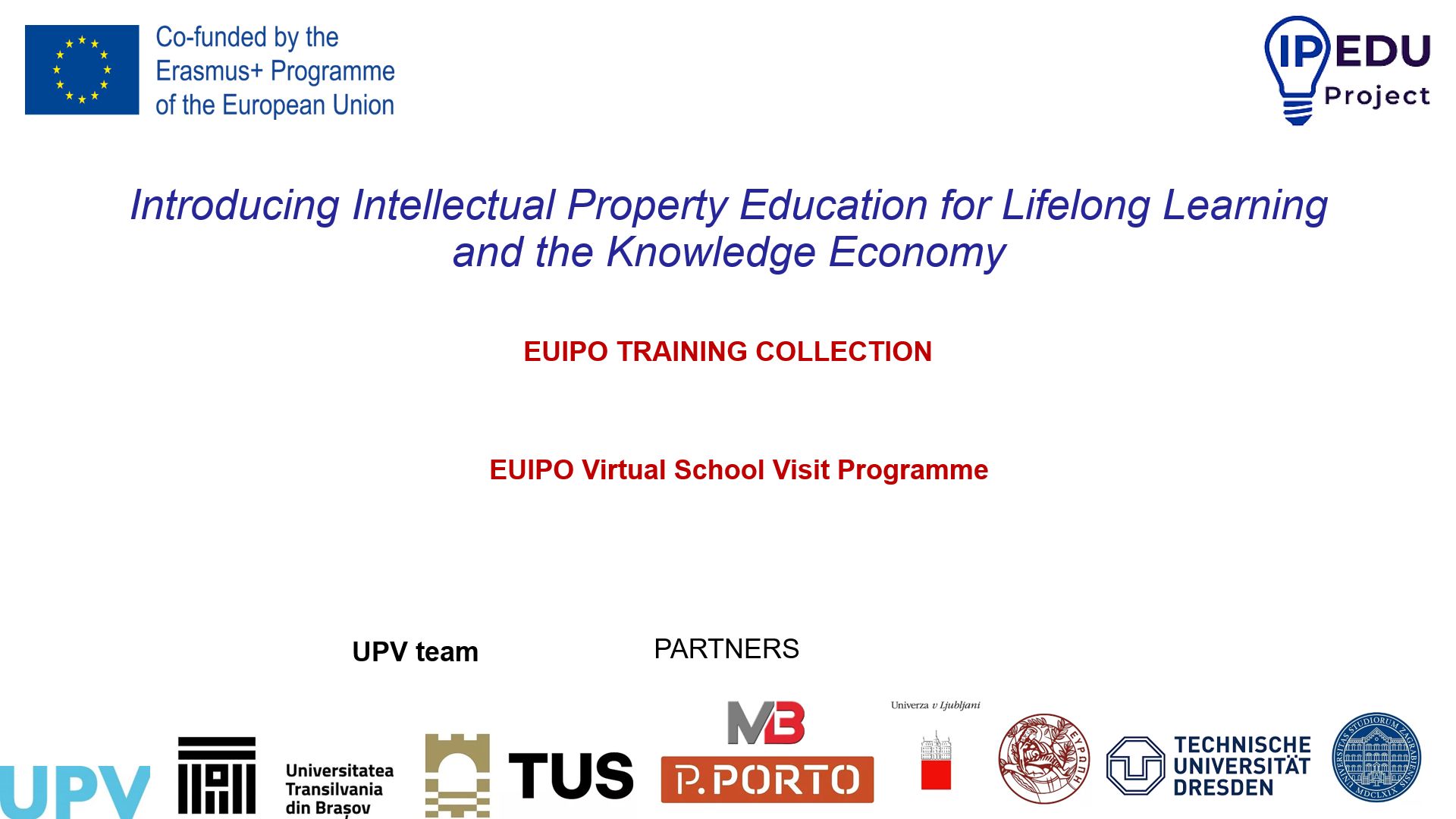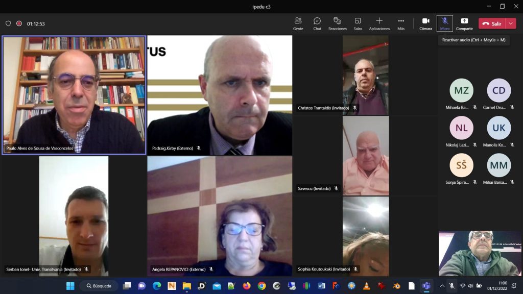 the IPEDU programAt the beginningpartners assistantspartners assistantsMr. Ivan Čolakovac presentation from University of ZagrebIP training pills from UPV teamRomanian Partners teamMs. Irene Montagud presentation UPV’ lawyerMB Think thank presentationOn line participants: Ms. Vicky Tsagkaraki from University of Crete, Mr. Jerald Cavanagh (Nazarbayev University Library) and Mr. Paulo Alves de Sousa de Vasconcelos from Instituto Politécnico do Porto, Portugal