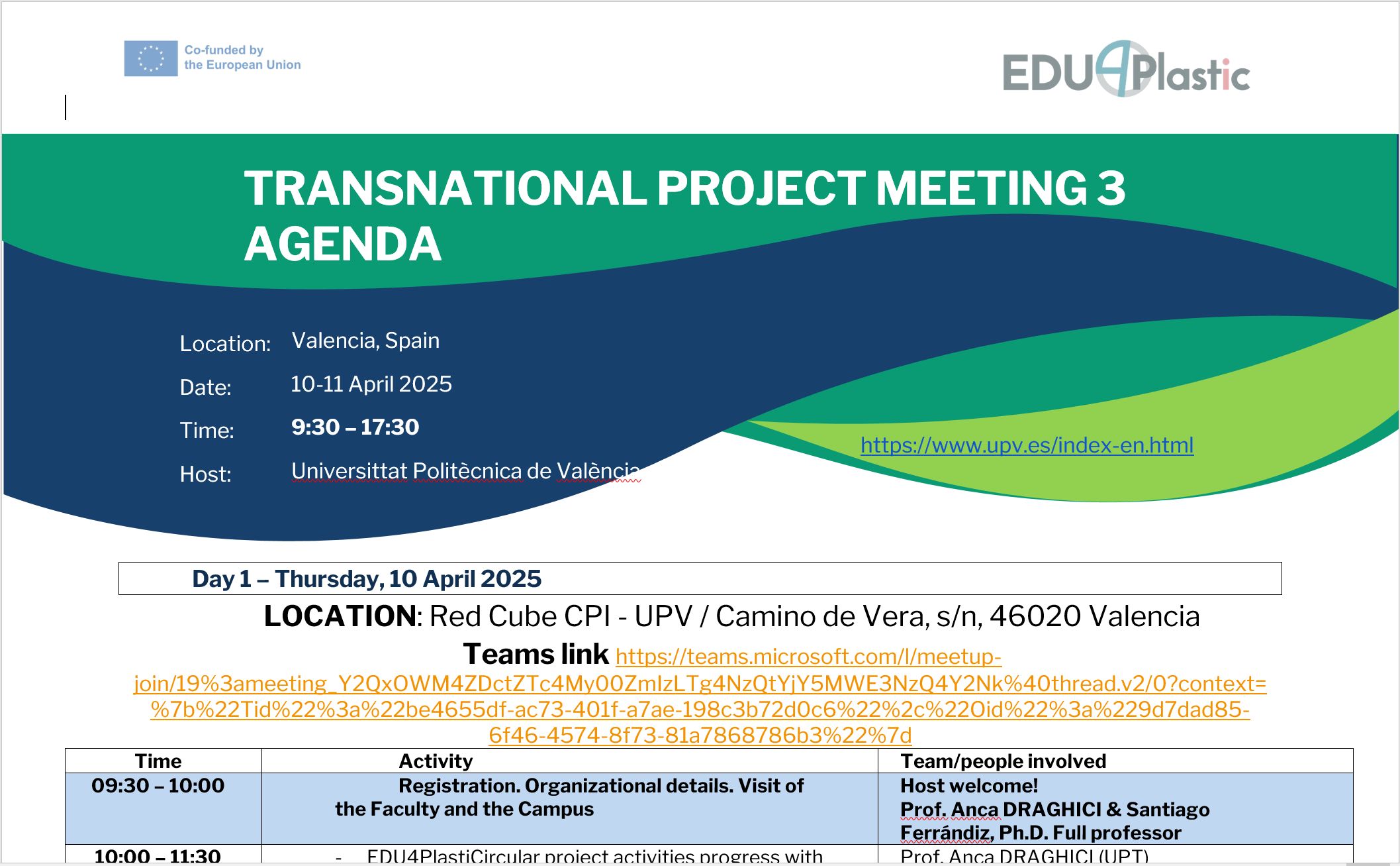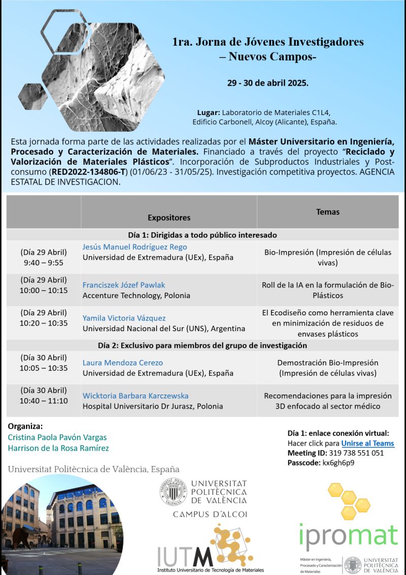 This conference is part of the activities carried out by the Master’s Degree in Engineering, Processing and Characterisation of Materials. Funded through the project «Recycling and Valorisation of Plastic Materials. Incorporation of Industrial and Post-consumer By-products (RED2022-134806-T) (01/06/23 – 31/05/25). Competitive research projects. STATE RESEARCH AGENCY.