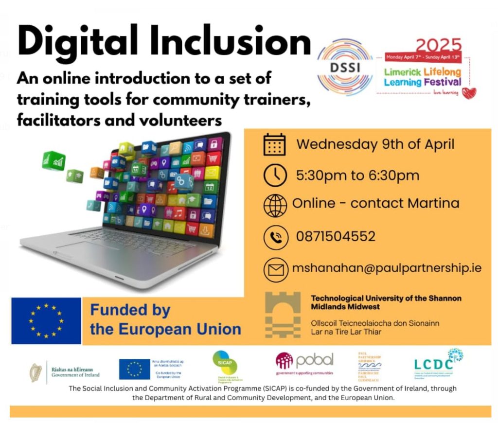 We are participating in the Limerick Lifelong Learning Festival 2025 under the theme «Literacy for Life» and as part of the festival the «Digital Services & Senior’s Inclusion (DSSI)» project: The potential of a Libraries & Communities Alliance in the post COVID Era» EU project will be featured in a special session at the festival dedicated to the DSSI project.