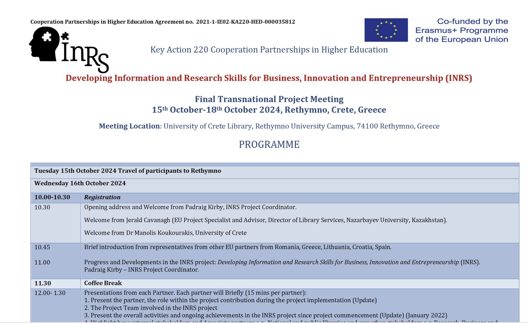 The INRS final project meeting was held at the University of Crete (Rethymo) on 16th and 17th October.