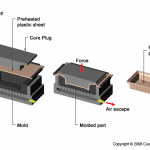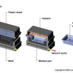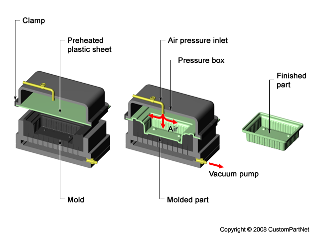 Vacuum thermoforming: (1) a flat plastic sheet is softened by heating; (2) the softened sheet is placed over a concave mold cavity; (3) a vacuum draws the sheet into the cavity; and (4) the plastic hardens on contact with the cold mold surface, and the part is removed and subsequently trimmed from the web.