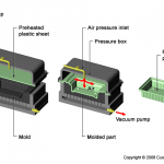 C.- Formado a presión: similar al moldeo por vacío, sobre la lámina se aplica además aire comprimido hasta 1,4 MPa, por lo que el sistema precisa de una cámara cerrada superior. Este procedimiento se utiliza para conformar lámina de pequeña galga de materiales como el PP, que se suministran en rollo, o para transformar lámina de gran espesor en piezas con detalle superficial fino.