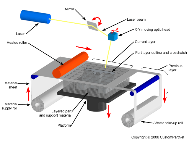 El primer sistema comercial de fabricación laminada de objetos (LOM) sistema apareció en 1991. LOM fue desarrollado por Helisys de Torrance, CA. Los componentes principales del sistema son un mecanismo de alimentación que hace avanzar una hoja sobre una plataforma de generación, un rodillo calentado para aplicar presión para unir la lámina a la capa de abajo, y un láser para cortar el contorno de la pieza en cada capa de la hoja. Partes son fabricadas por apilamiento, unión y corte de capas de material laminar revestido con adhesivo en la parte superior de la anterior. Un láser corta el contorno de la pieza en cada capa. Después de cada corte se ha completado, la plataforma desciende por una profundidad igual al espesor de la chapa (típicamente en 0.002-0.020), y otra hoja se avanza en la parte superior de las capas previamente depositadas. La plataforma se eleva entonces ligeramente y el rodillo calentado se aplica presión para unir la capa nueva. El láser corta el contorno y el proceso se repite hasta que la parte se ha completado. Después de una capa se corta, el material extra permanece en el lugar para apoyar la pieza durante la compilación.